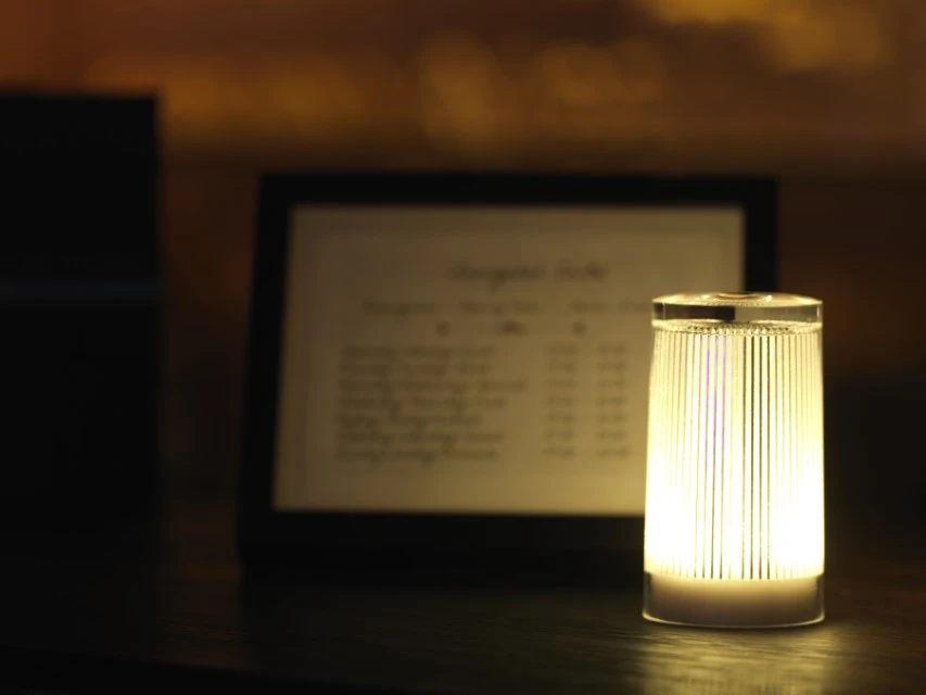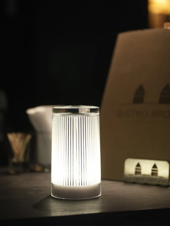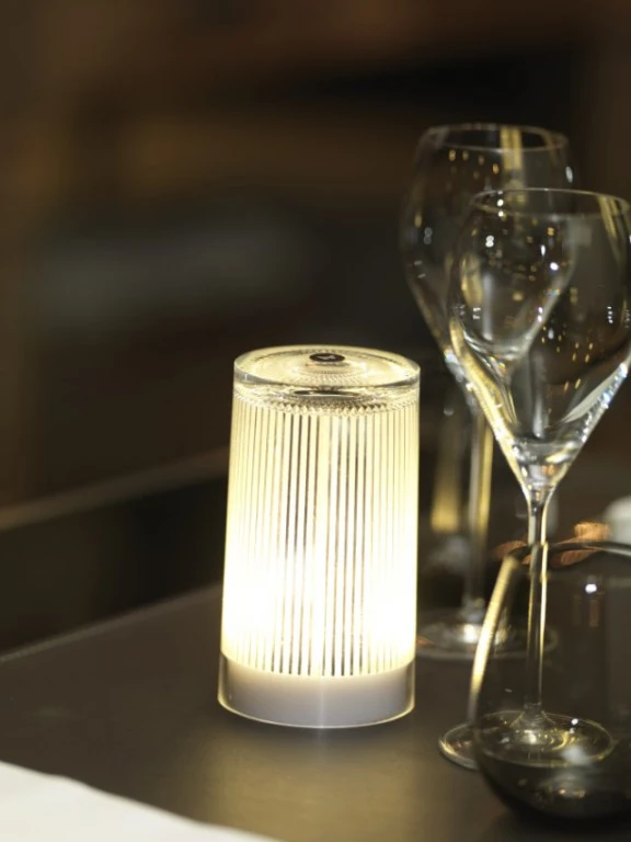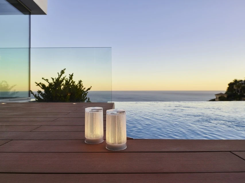 Indoor-/Outdoor-Produkt aus Acryl (PMMA) und Polycarbonat (PC), kein Rosten, keine Oxidation, keine Entfärbung, hoher UV-Schutz, blendfrei, regen- und stoßfest. Eine raffinierte Lampe mit dem Look, Touch und Feel von Glas. Diese zylinderförmige Leuchte ist perfekt verarbeitet mit einem gestreiften, funkelnden Muster auf der Innenseite.