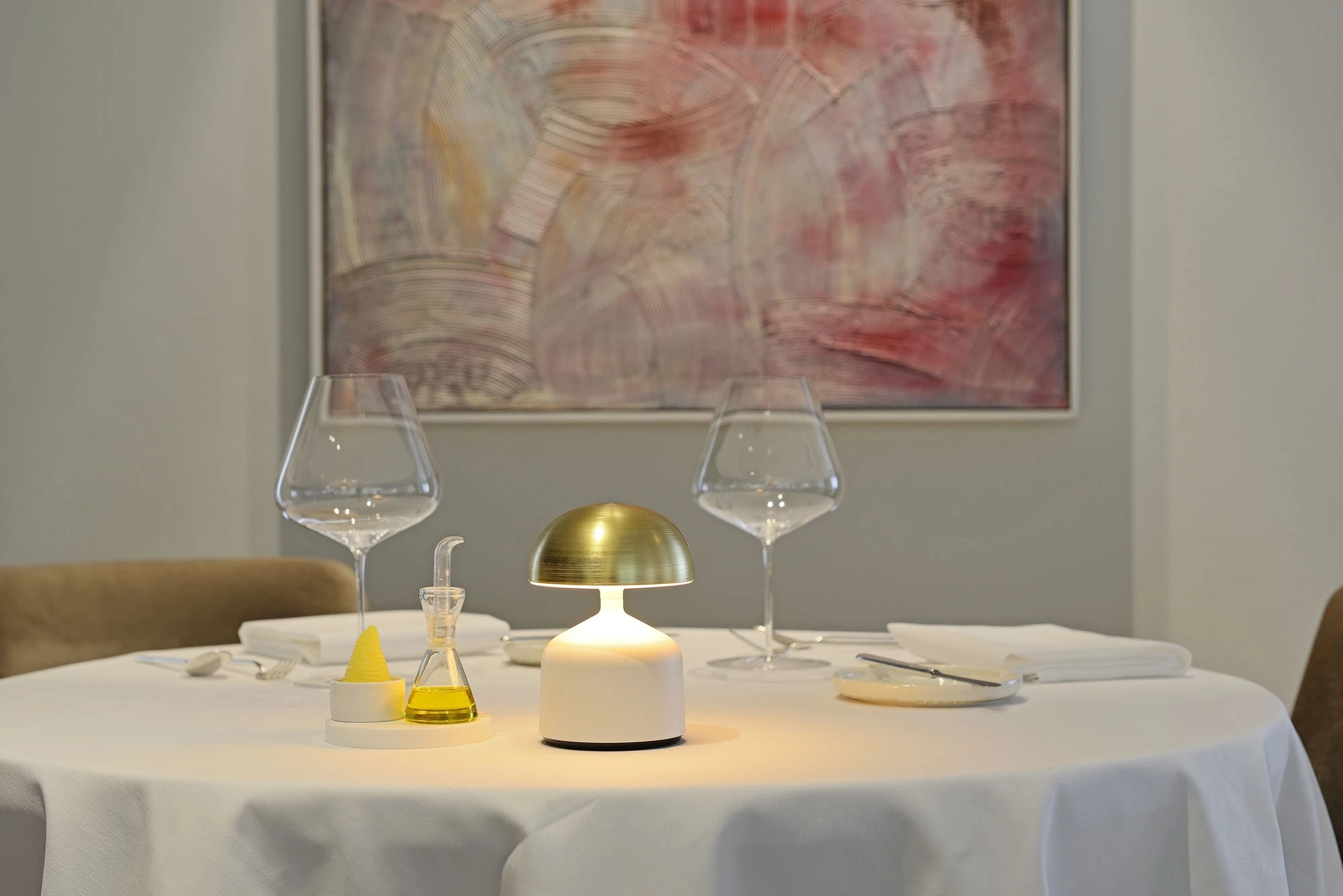 Indoor/outdoor lamp available in a short version with 6 illuminated heads and with the ability to light-up warm white in both 2300 Kelvin and 2700 Kelvin. An optional battery slot guarantees only one recharge a week.