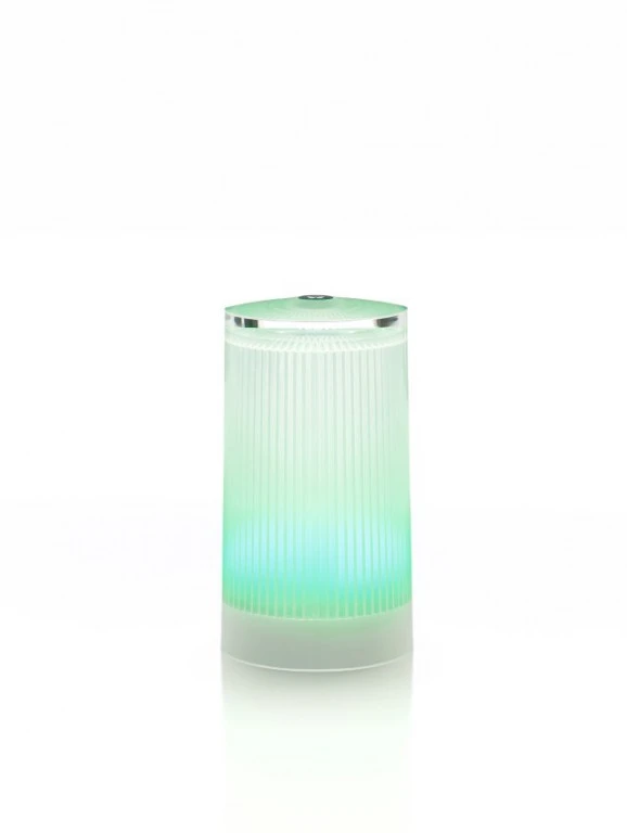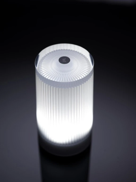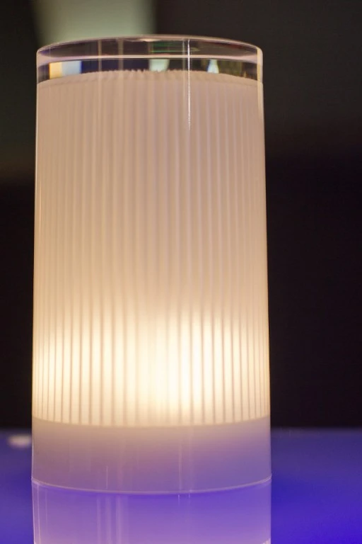Indoor/outdoor product made of Acrylic (PMMA) and Polycarbonate (PC), no rusting, no oxidizing, no decolourizing, high UV-protection, anti- glare, rainproof and shock resistant. A refined lamp with the look, touch and feel of glass. This cylindric shaped lamp is perfectly finished with a striped pattern on the inside.