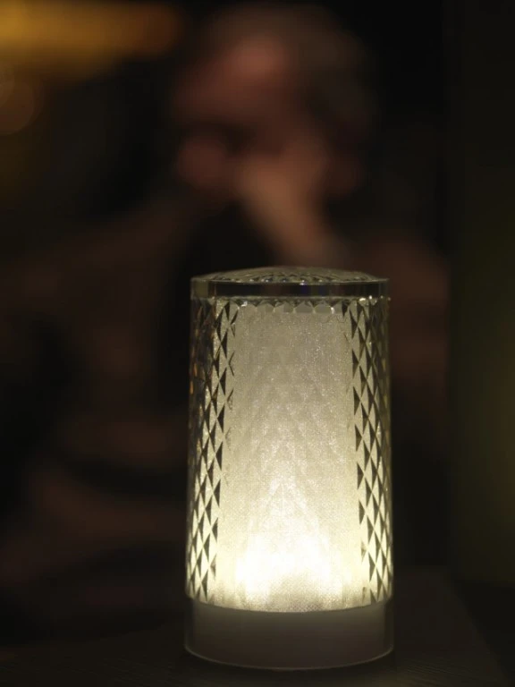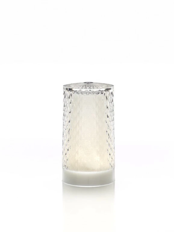 Indoor/outdoor product made of Acrylic (PMMA) and Polycarbonate (PC), no rusting, no oxidizing, no decolourizing, high UV-protection, anti- glare, rainproof and shock resistant. A refined lamp with the look, touch and feel of glass. This cylindric shaped lamp is perfectly finished with a sparkling pattern on the inside.